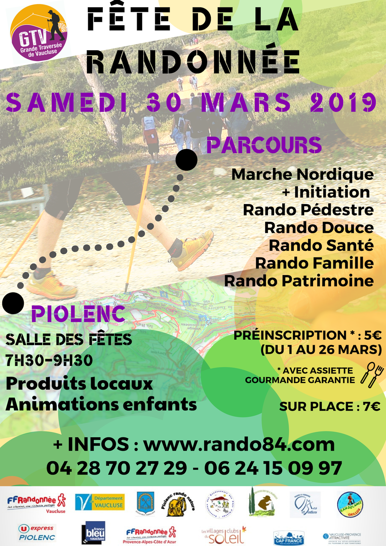 Le Comité Départemental de la Randonnée du Vaucluse et les associations du secteur Haut-Vaucluse : Piolenc Rando Nature, ARPO (Orange), Cimes et Sentiers (Vaison-la-Romaine), Les Randonneurs de l´Harmas (Sérignan-du-Comtat) et Randolance (Grillon) vous propose la Fête de la randonnée.